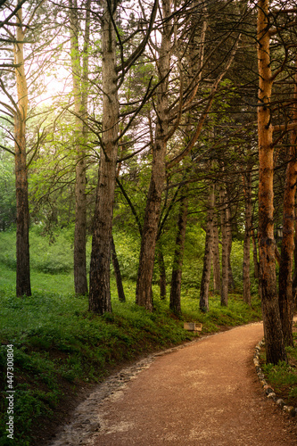 Aerial view of summer green trees in forest in mountains. Forest Tree Woods.