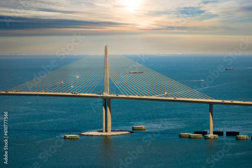 Aerial view of Sunshine Skyway Bridge over Tampa Bay in Florida with moving traffic. Concept of transportation infrastructure