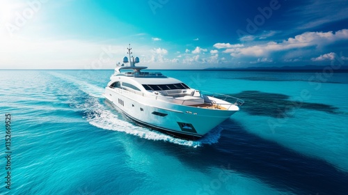 Aerial view of the reef, with a luxury yacht docked near it, beautiful blue water.