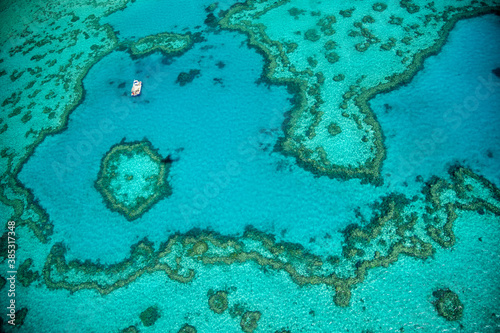 Aerial view of the amazing Queensland Coral Reef from the airplane. Coral patterns overhead view