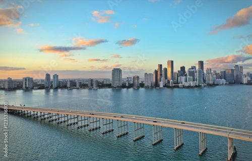 Aerial view of the Miami skyline at sunset from Biscayne Bay. Miami, Florida, USA.