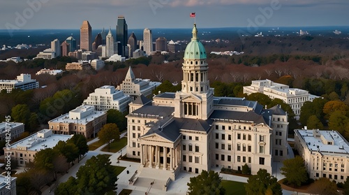 Aerial view of the North Carolina State Capitol and Raleigh skyline.generative.ai