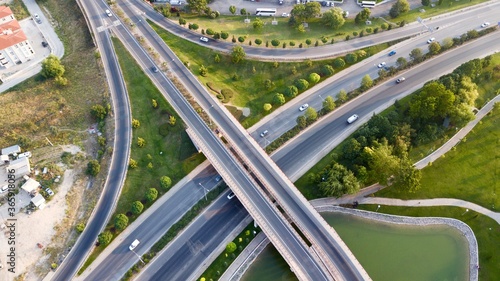 Aerial view of the roundabout on the river. Trees, overpass, buildings and vehicles can be seen.