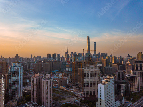 Aerial view of the skyline in Shanghai, China, shot at sunset.