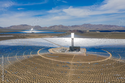 Aerial view of the solar tower of the Ivanpah Solar Electric Generating System