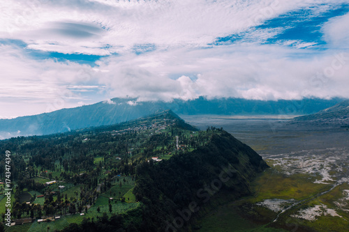 Aerial view of the vibrant green hills contrasting against the volcanic ash plains under a cloudy sky, Mt. Bromo, East Java, Indonesia.