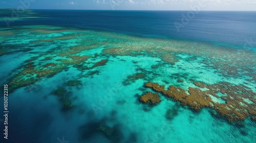 Aerial view of the vibrant reefs of the Belize Barrier Reef, space for copy above