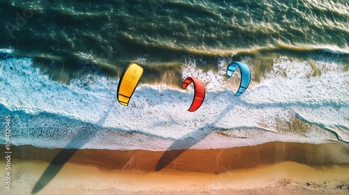 Aerial view of three colorful kitesurfing kites soaring over waves at the beach.