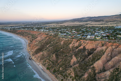 Aerial view of tranquil Sellicks Beach with scenic cliffs and waves, Fleurieu Peninsula, Australia.