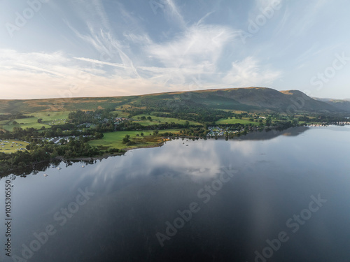 Aerial view of tranquil Ullswater lake surrounded by lush rolling hills at sunset, Pooley Bridge, England.