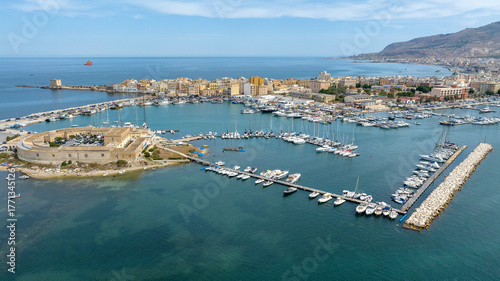 Aerial view of Trapani, Sicily, Italy. It is a Sicilian city with a port overlooking the Mediterranean Sea. Mount Erice dominates the town in the background.