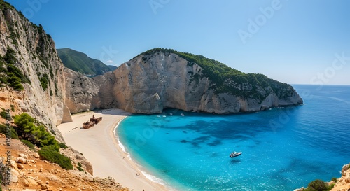 Aerial View of Tropical Cliffside Beach with Turquoise Water and Rocky Islands