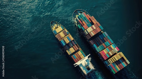 Aerial view of two cargo ships loaded with colorful containers sailing on a deep blue sea, high - contrast, vibrant colors, realistic photography