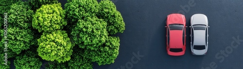 Aerial view of two parked cars beside lush green trees, set against a paved surface, highlighting nature and urban life.