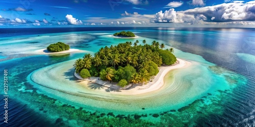 Aerial view of two tropical islands connected by a sandbar surrounded by crystal clear waters, with palm trees and lush green vegetation on both islands, beach, island