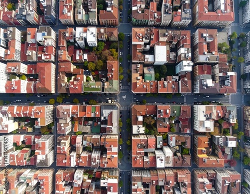 Aerial View of Urban Neighborhood with Red Roofs and Streets