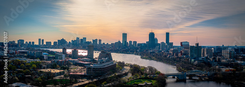 Aerial view of urban skyline with charles river and city lights, boston, massachusetts, united states.