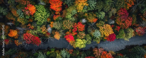Aerial view of vibrant autumn forest with colorful trees in reds, oranges, and greens, creating a stunning natural landscape from above.
