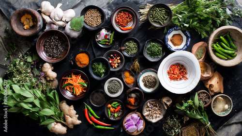 Aerial view of vibrant Southeast Asian ingredients on slate, showcasing spices and fresh herbs.