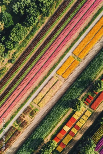 Aerial view of vibrant tulip fields and colorful flower rows in spring season showcasing agriculture and natures beauty in rural landscape.