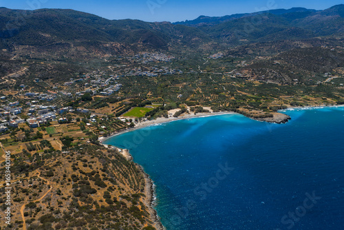 Aerial view of Voulisma Beach in Crete, Greece, featuring turquoise waters, sandy shores, lush greenery, olive groves, and rugged hills in the background.