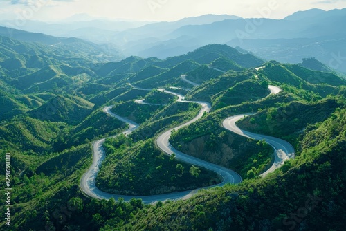 Aerial view of winding road through mountains, free space.