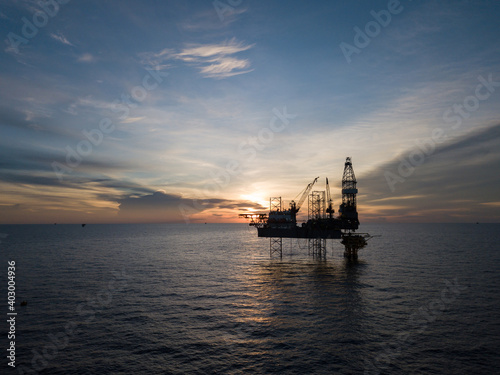 Aerial view offshore drilling rig (jack up rig) at the offshore location during sunset
