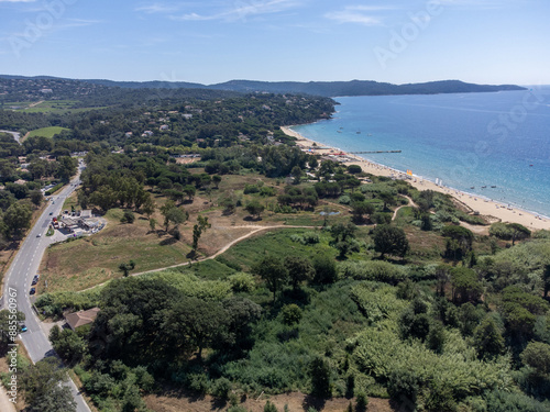 Aerial view on boats, crystal clear blue water of Plage du Debarquement white sandy beach near Cavalaire-sur-Mer and La Croix-Valmer, summer vacation on French Riviera, Var, France