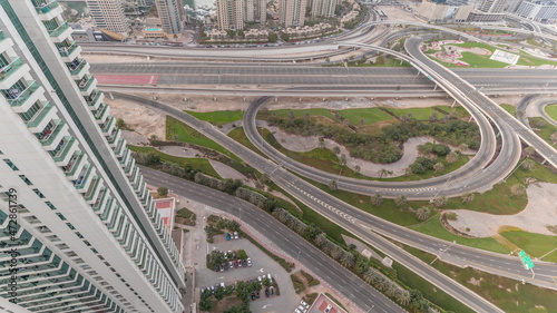 Aerial view on Dubai Marina with big highway intersection timelapse and skyscrapers around, UAE