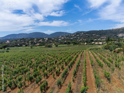 Aerial view on hills, houses and green vineyards Cotes de Provence, production of rose wine near Saint-Tropez and Pampelonne beach, Var, France in summer