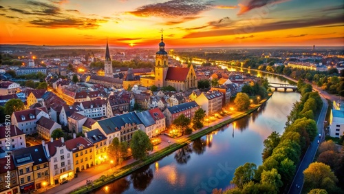 Aerial View Opole Poland Cityscape Bokeh Sunset, Romantic Cityscape, Central Europe, Old Town, Travel Photography