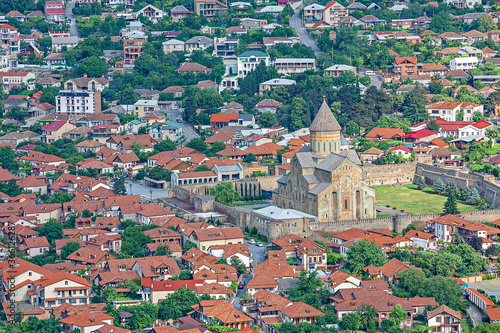 Aerial view over the old town Mtskheta and the Cathedral of Svetitskhoveli in Georgia, Caucasus