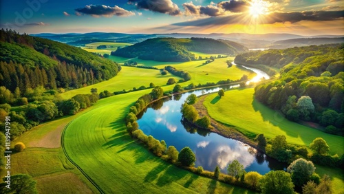Aerial View River Valley Landscape: Green Field, Winding River, Lush Trees, Rolling Hills