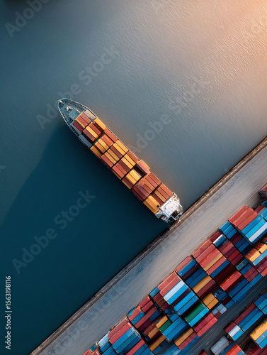 Aerial view showcasing a cargo ship loaded with containers entering a port. Illustrates global trade, logistics, and the supply chain. Perfect for business industry content.