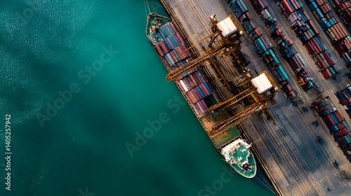 Aerial view shows a large container ship docked at a busy port terminal with stacked colorful containers and gantry cranes, deep teal water dominating the left side for clean composition.