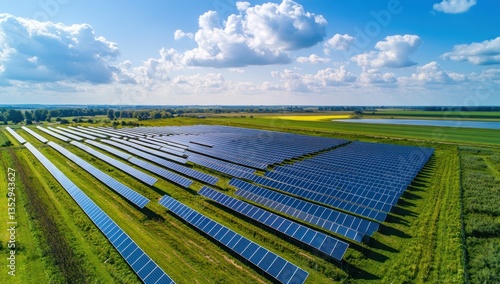 Aerial view shows a large field of solar panels