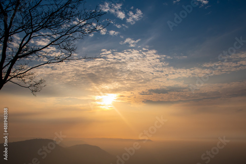 aerial view silhouette tree growing on the top of the mountain orange sunrise Morning sky, clouds, sunset view, mountain ranges and cloudy sky reflecting sunlight yellow nature