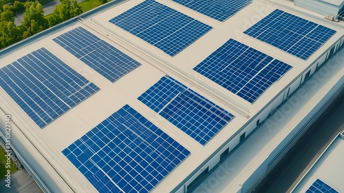 Aerial View Solar Panels on Factory Roof - Sustainable energy