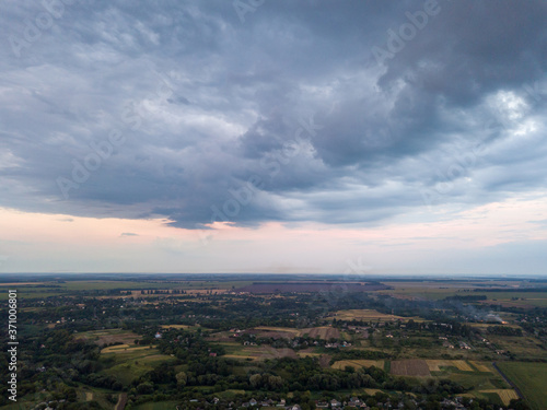Aerial view. Sunset over Ukrainian agricultural fields.