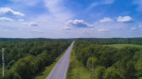 Aerial views of a long, empty road cutting through dense green forests under a bright blue sky with scattered clouds, showcasing natural landscapes and rural highways