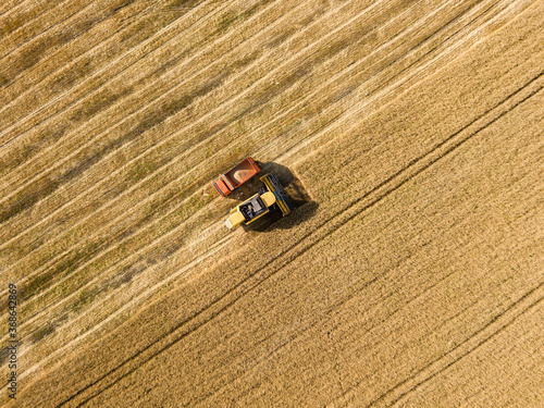 Aerila drone view. The harvester pours the wheat crop into the truck.