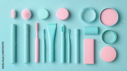Aesthetic Arrangement of Pastel Blue and Pink Personal Care Items on a Soft Background for Beauty and Skincare Related Designs and Projects