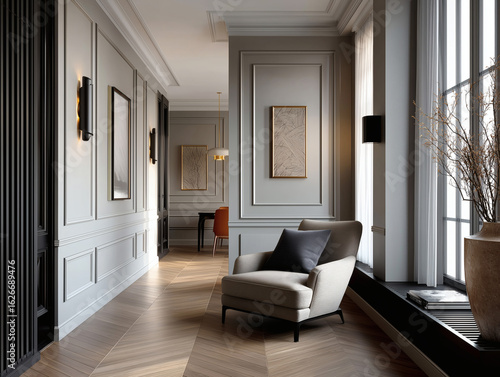Aesthetic beautiful elegant modern luxury interior design. Clear mock up empty wall for decoration in the apartment, painting frame. Copy space in the room.