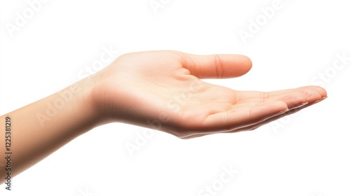 Aesthetic close-up of a feminine hand with fair skin extended open palm on a bright white background for conceptual imagery or advertising
