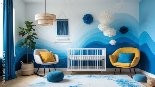 Aesthetic gradient white to blue themed nursery interior concept