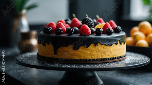 Aesthetic preparation of summer cake on a black themed kitchen. bokeh style.