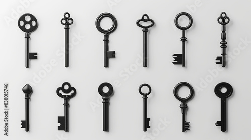 Aesthetic set of 3d different old vintage door keys on white clean background, minimalism concept. Generative AI