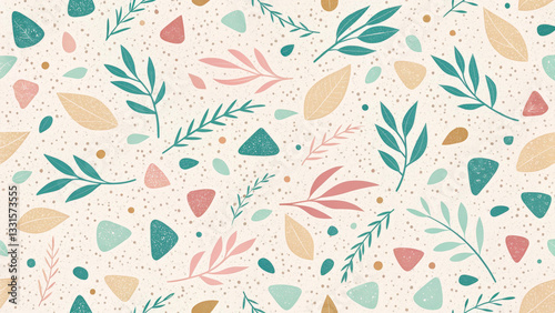 Aesthetic terrazzo pattern in pastel tones, split into two variations—one with a minimalist speckled texture and the other enriched with botanical leaf details. A modern and stylish design perfect for