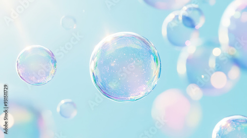 Aesthetic transparent soap bubbles floating on pastel blue background. Detergents and cleaning products. Generative AI