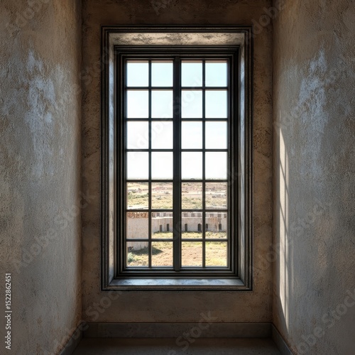 Aesthetic View Through Vintage Window Framed by Rustic Walls Illuminated by Soft Natural Light